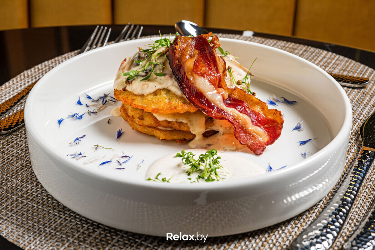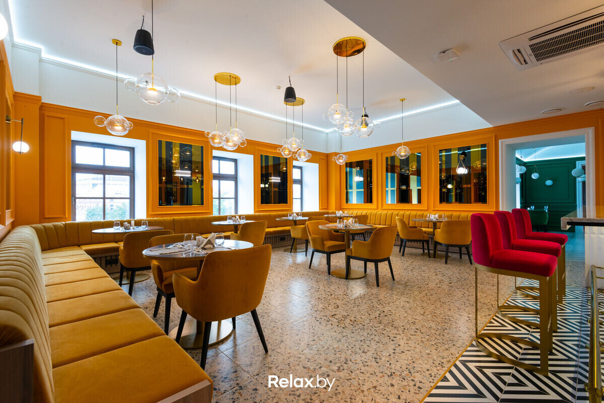 Среди позиций в меню — авторское прочтение европейской классики, а также традиционные блюда белорусской кухни в современной интерпретации. Дополняют все вина Старого и Нового Света, коктейльная карта, крепкие алкогольные напитки.