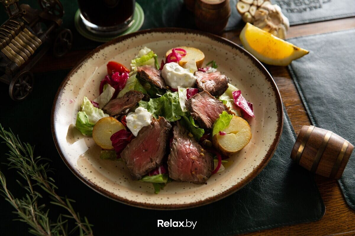Рецептура блюд в заведении основано на лучших национальных позициях белорусской, чешской, немецкой и европейской кухонь. Угощения гости получают в виде больших, если не сказать огромных, порций. Для приготовления каждого блюда — от салата или сочного стейка — используются исключительно натуральные ингредиенты от фермерских хозяйств Беларуси.
