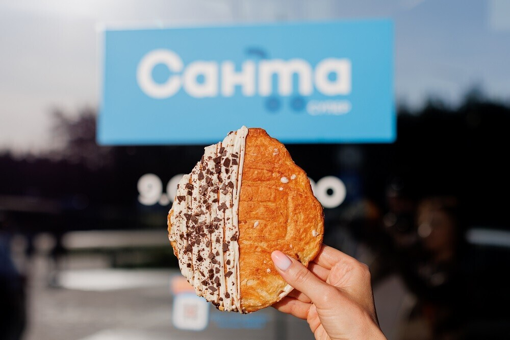 В магазинах «Санта» уже выпекают два вида плоских круассанов: с шоколадной глазурью и ореховой крошкой («Крунж арахисовый») и ванильной глазурью и шоколадной крошкой («Крунж шоко»). Отличает их хрустящая корочка и плотная структура, которая не крошится, в отличие от французского круассана, и больше напоминает слоеный снэк. Стоит недорого: всего 2 рубля 99 копеек.