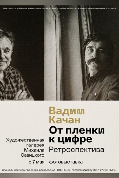 7 мая 2024 года в 18:00 в Художественной галерее Михаила Савицкого состоится открытие персональной фотовыставки почетного члена Белорусского общественного объединения фотографов, члена Белорусского союза дизайнеров Вадима Качана «От пленки к цифре. Ретроспектива». Выставка приурочена к 65-летию автора. Время изменяет Минск непрерывно, но на фотографиях Вадима Качана сохраняется старый Верхний город с его уютными двориками, застроенными жилыми домами, неширокими улицами, вымощенными булыжником, местными жителями и случайными прохожими.