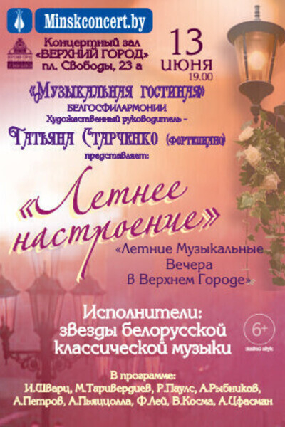 Летние музыкальные вечера в Верхнем Городе - это особенное настроение, удивительная атмосфера и самые яркие программы гостиной Татьяны Старченко. Программа «Летнее настроение» подчеркнёт очарование летнего вечера: мелодии из любимых кинофильмов, джазовые композиции, танго, песни прошлых лет в инструментальном исполнении.