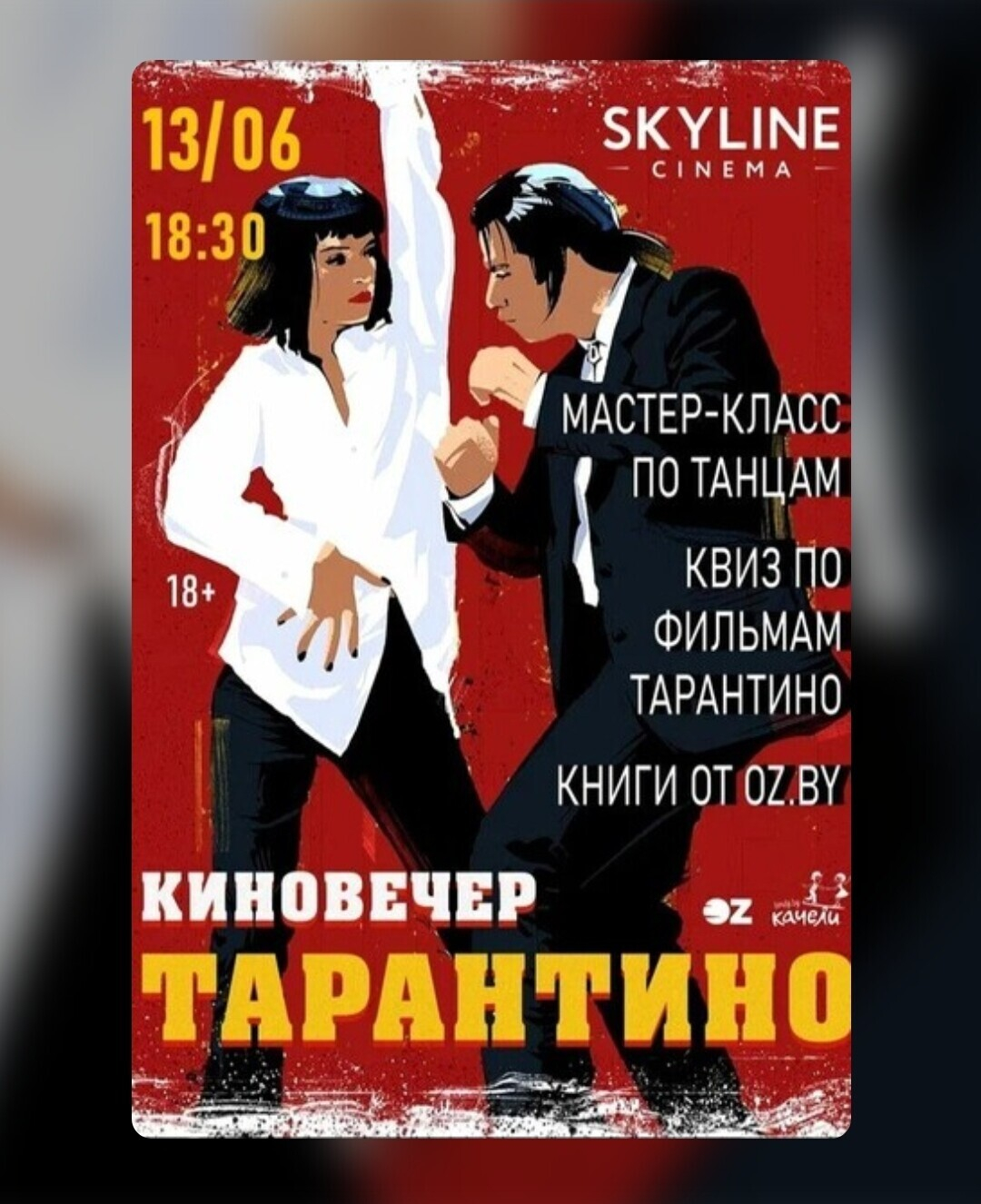 Кинотеатр SKYLINE напоминает, что 30 лет назад на Каннском кинофестивале состоялась премьера одного из самых безумных, наглых и захватывающих дух фильмов в истории кинематографа — «Криминальное чтиво». Будет квиз по фильмам Квентина Тарантино с призами для победителей и мастер-класс по танцам в стиле Твист от студии танца «Качели».