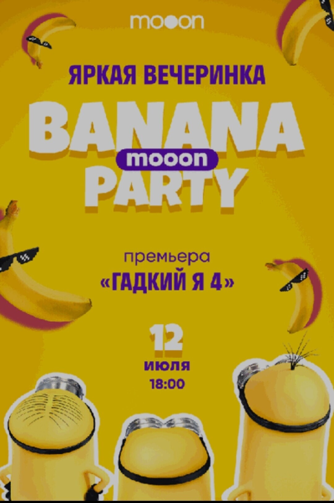 На один день кинопространство mooon в ТРЦ Palazzo превратится в банановый рай. Вас зовут присоединиться к веселью. В программе: детские развлечения и захватывающие конкурсы, ростовые куклы миньонов, угощение в виде бананов, веселые аниматоры и самое интересное – просмотр мультфильма «Гадкий Я 4». Дресс-код: желтый – будет конкурс на лучший костюм.