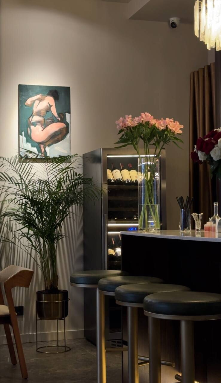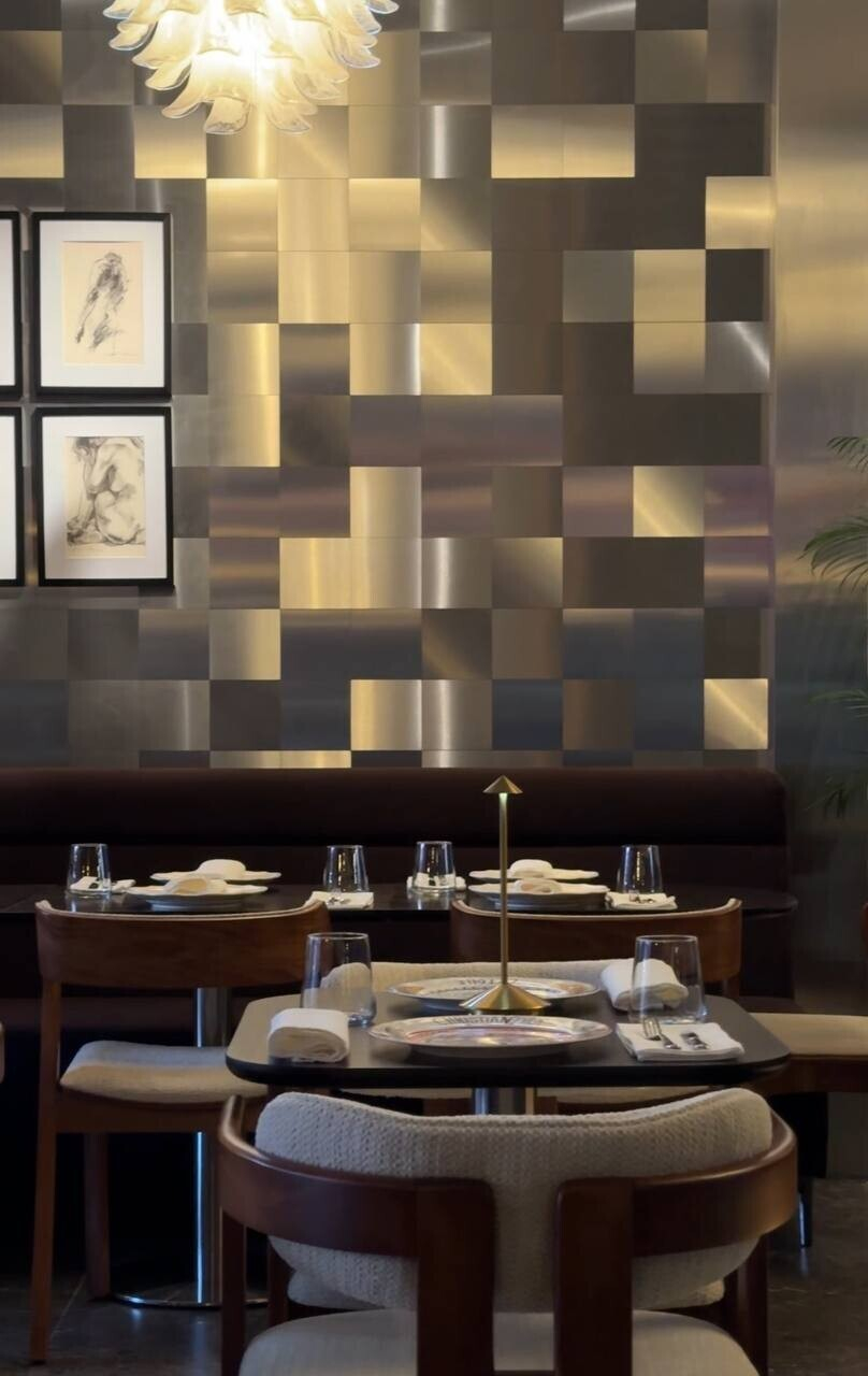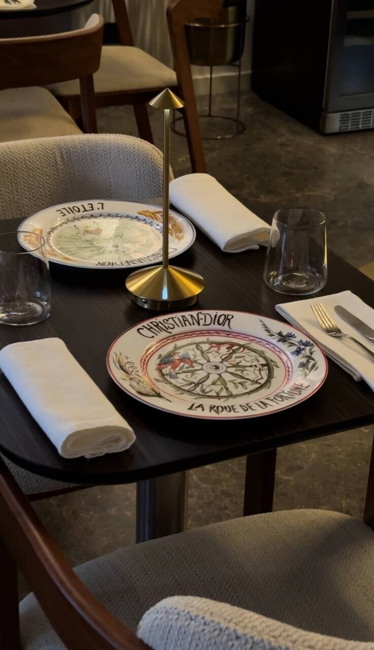В дизайне ставку сделали на современную классику, а морскую историю подчеркнули аквариумом с живыми гадами и акцентными светильниками, стекло которых напоминает волны (по крайней мере так показалось автору обзора). Небольшой контактный бар, достаточно плотная посадка (так как площадь бистро небольшая) и спокойная бежево-коричневая гамма. Разбавили спокойными картинами, мягким желтым светом. Детали как всегда решают: подмечаем хорошо подсвеченное зеркало для фото во весь рост, красочные тарелки Dior в сервировке, удобные уборные с именитыми баночками мыла и крема для рук.