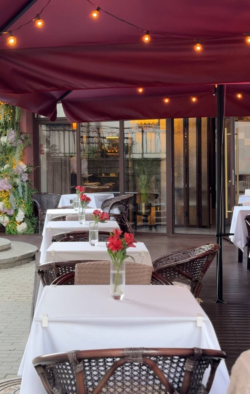 Заведение называет себя более демократично бистро, но вполне претендует на звание небольшого лампового ресторана. На входе встречает летняя терраса с белыми скатертями и живыми цветами на столах, удачно выглядят именные зонты в цвете бордо.