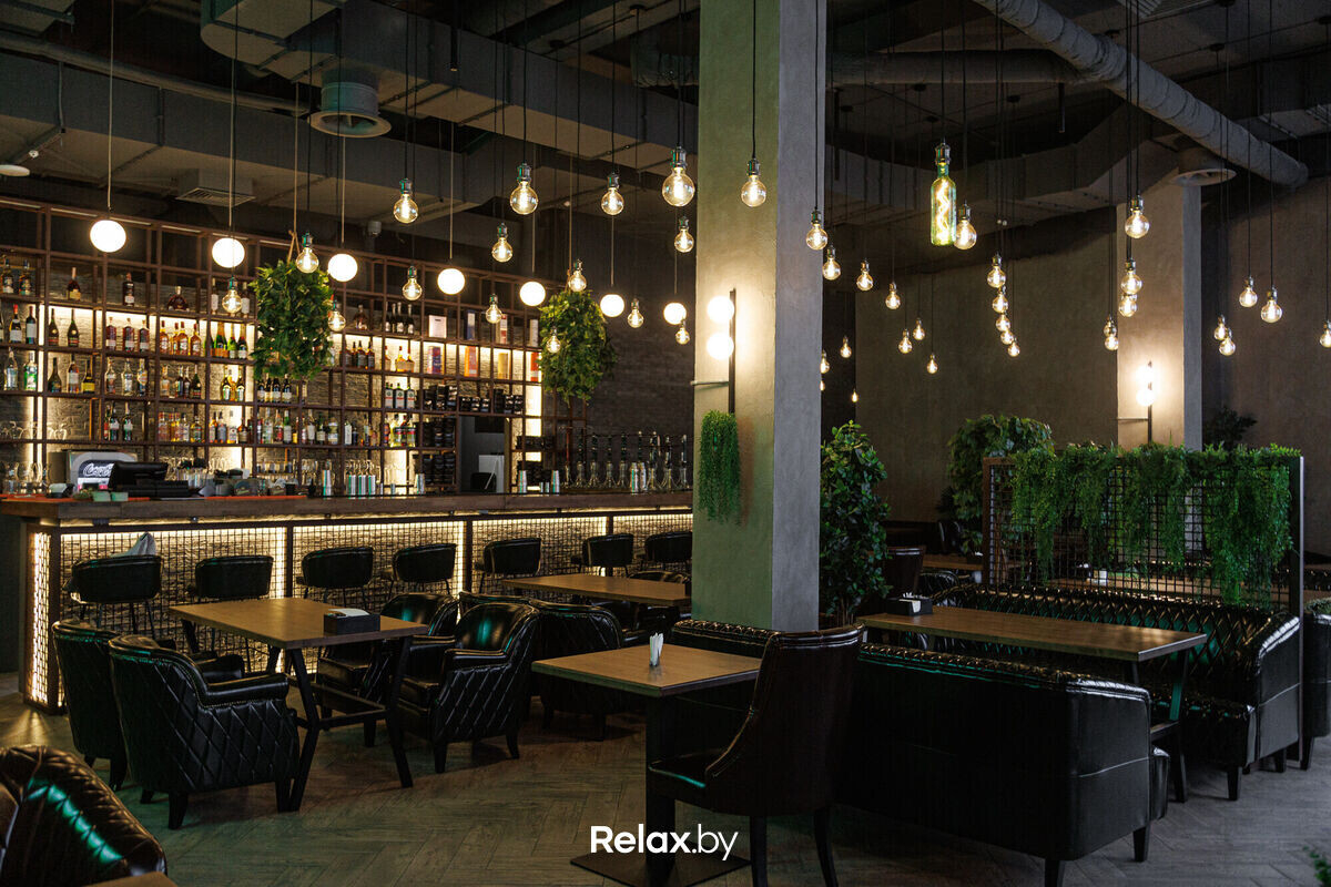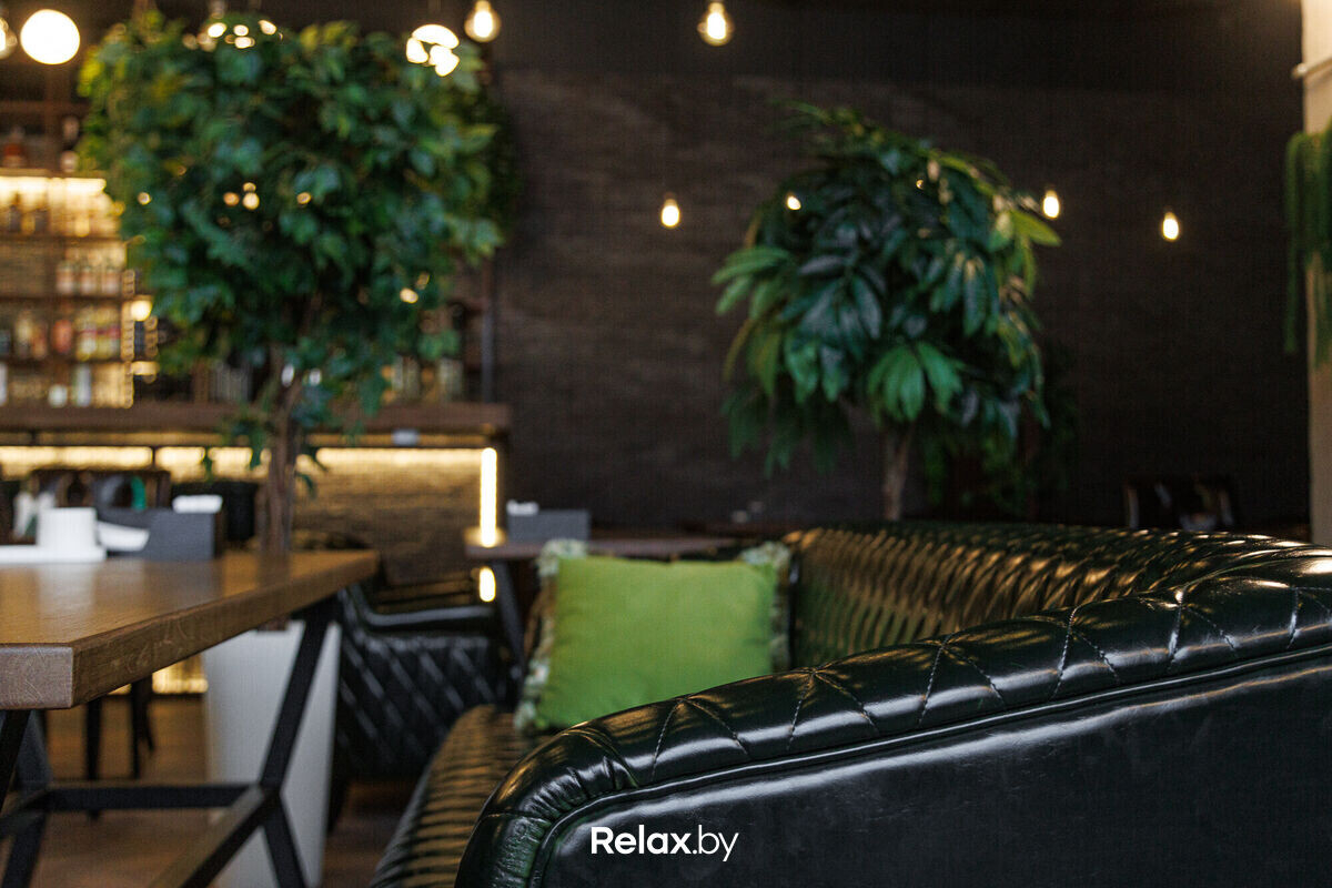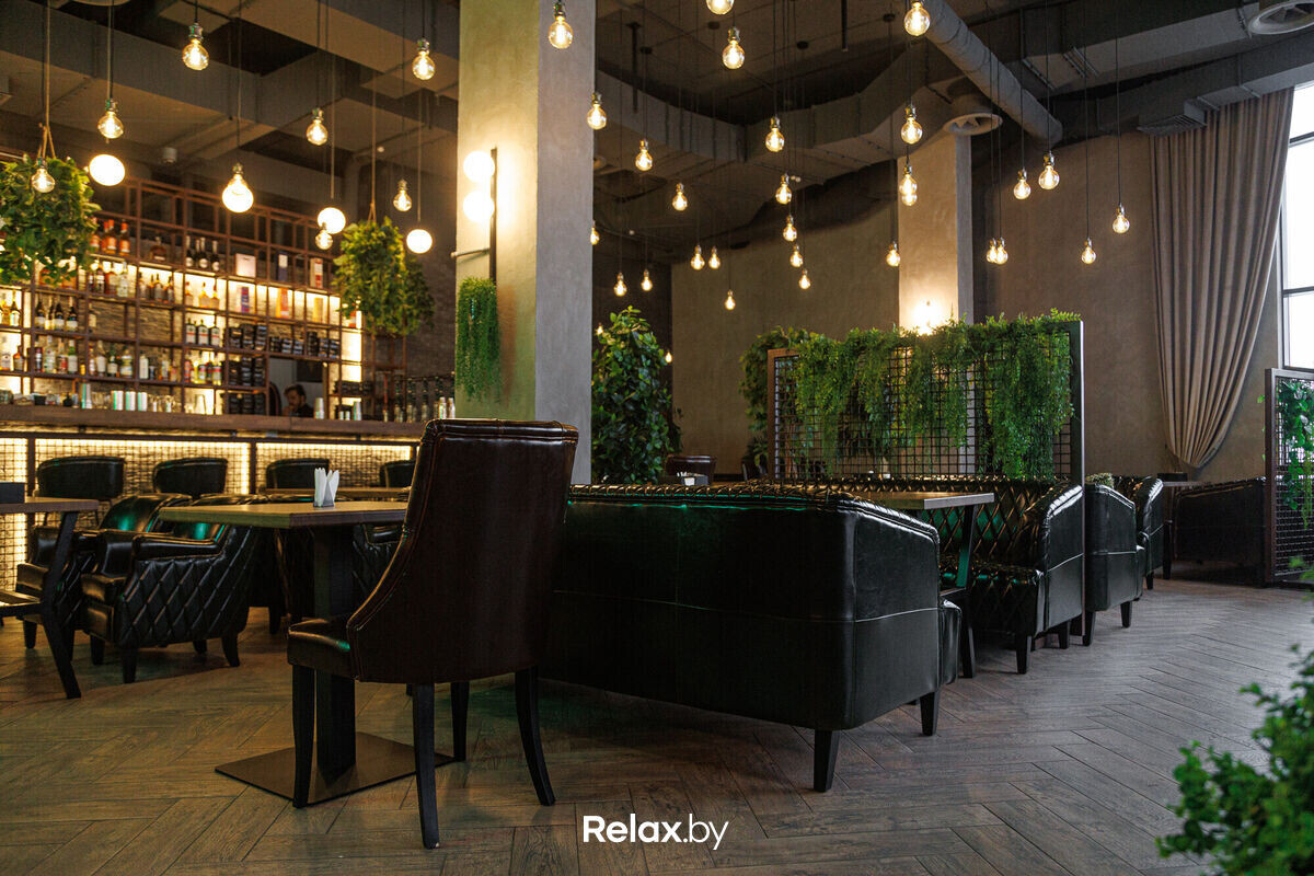 В интерьере узнаются фирменные штрихи Мята Lounge. Намеки на лофт, много зелени, комфортная кожаная мебель и удобное зонирование пространства. Много камерных зон, где можно уединиться своей компанией. Не обошлось и без контактной барной стойки.