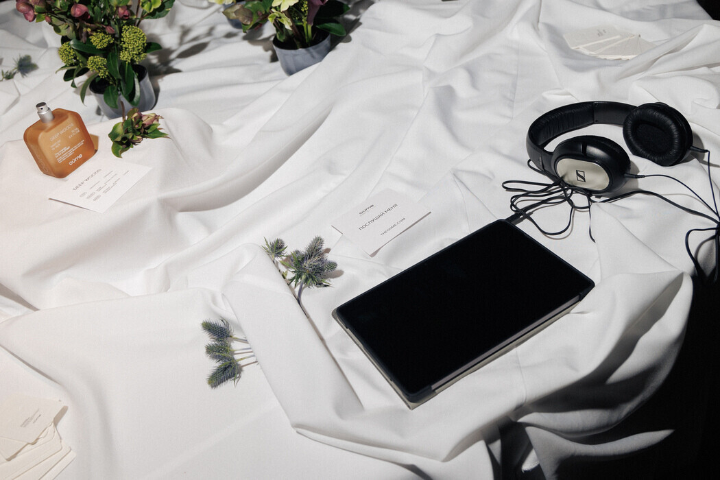 В отдельном уголке гости могли погрузиться в уникальный опыт знакомства с ароматами, используя специальные наушники — «послушать аромат». Этот подход позволял не только ощутить запах, но и услышать, как каждый из ароматов взаимодействует с окружающим пространством, создавая полную картину ощущений.