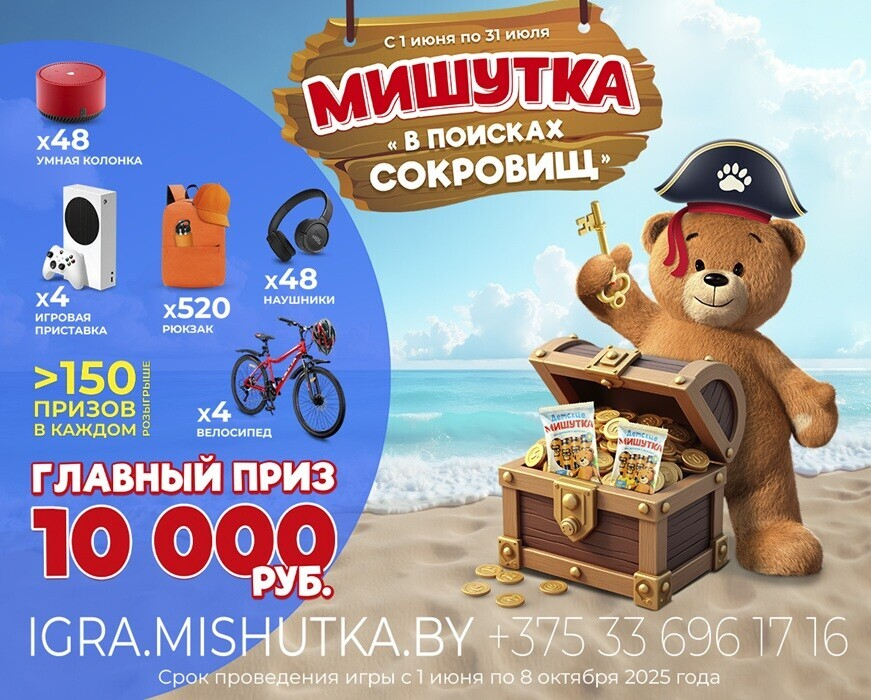 С 1 июня по 31 июля в Беларуси проходит захватывающая игра с сосисками «Мишутка». Каждый покупатель может стать участником розыгрыша и получить шанс на один из более чем 150 призов в каждом розыгрыше. Главное — главный приз в размере 10 000 рублей!