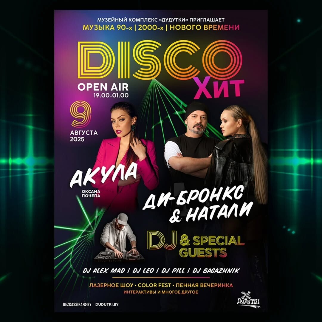 9 августа в Дудутках состоится одно из ярких музыкальных событий лета — open air-дискотека «ДискоХИТ», которая объединит хиты 90-х, нулевых и сегодняшних дней, живые выступления звезд и десятки тематических развлечений.