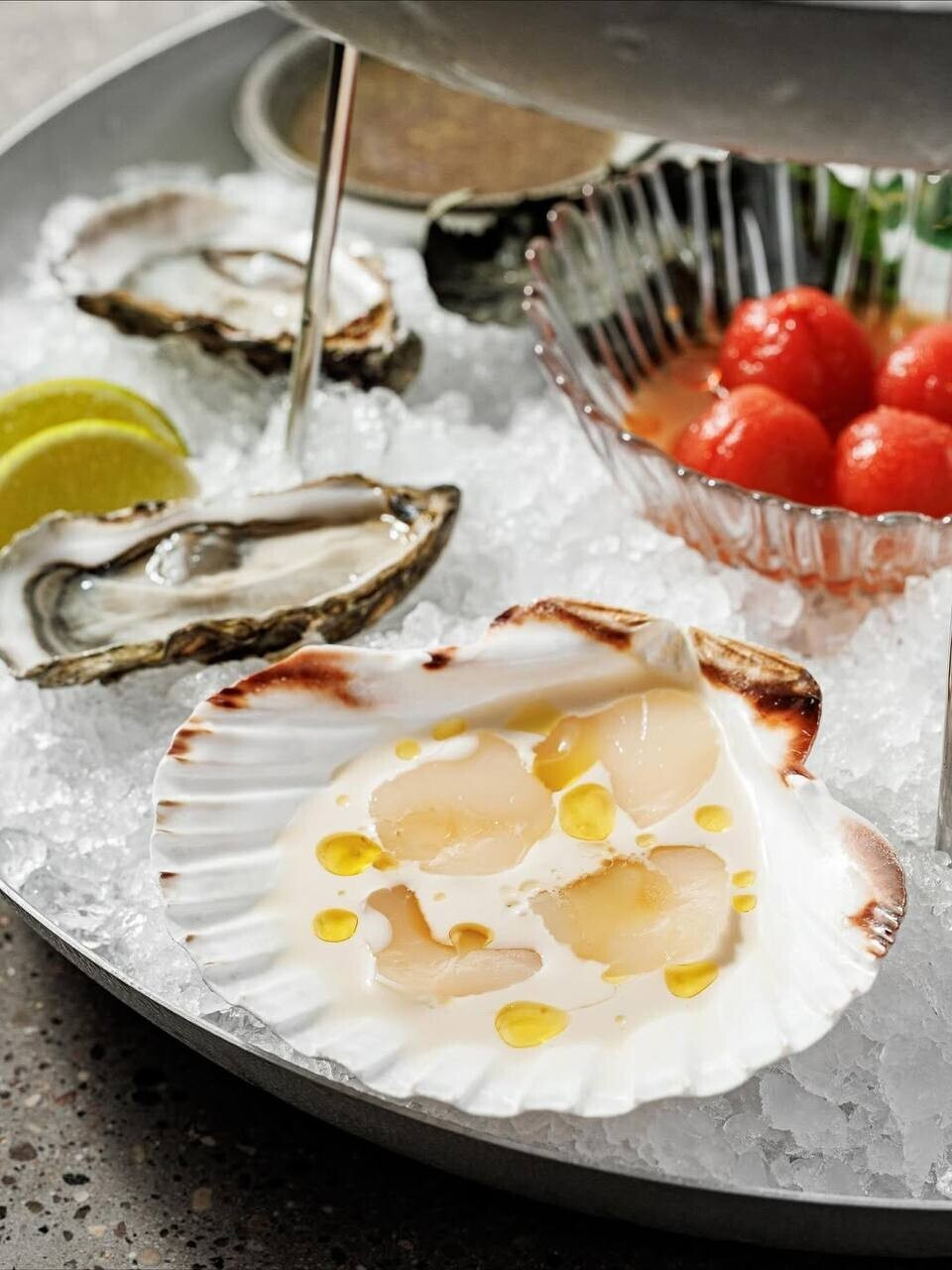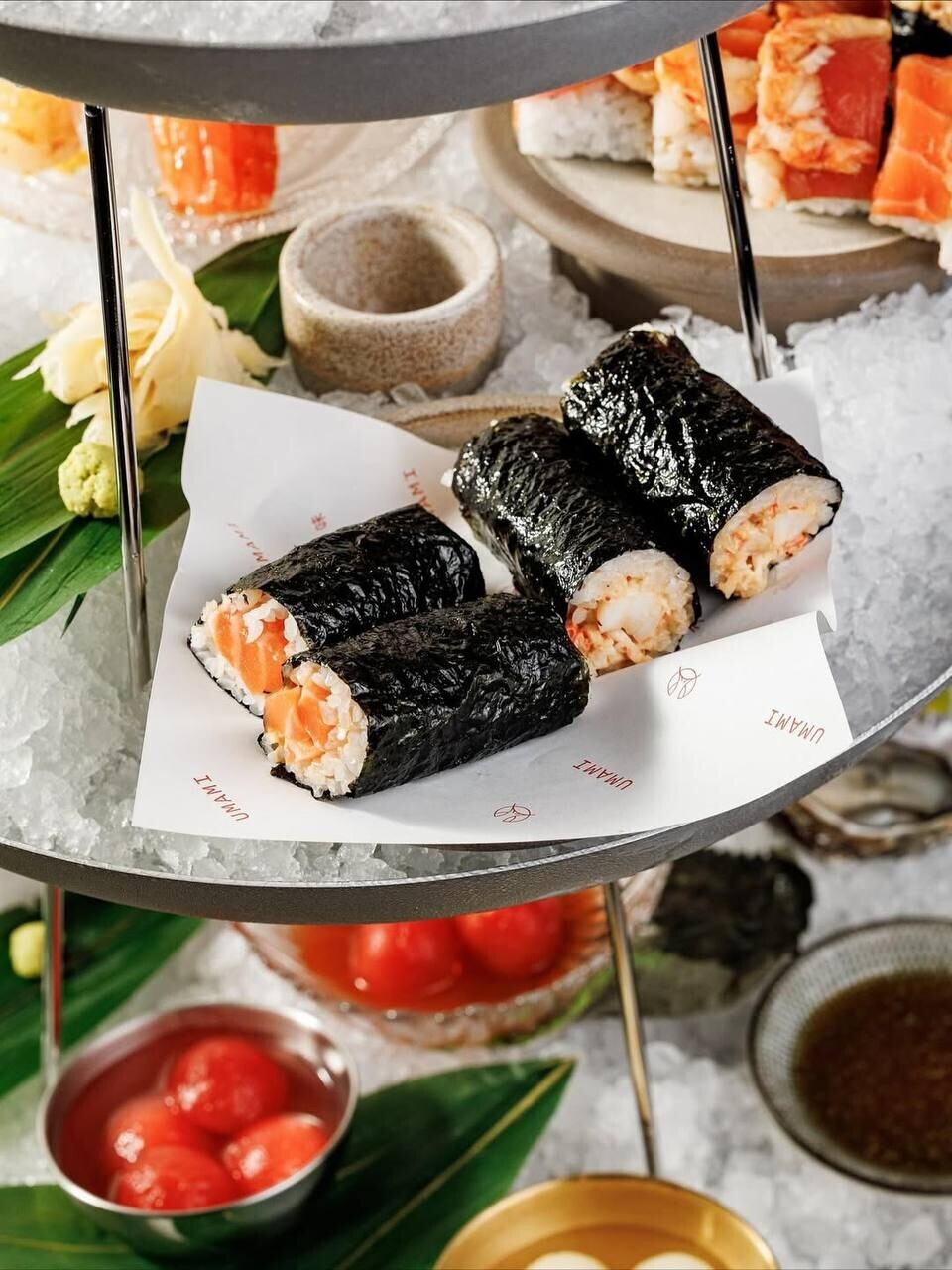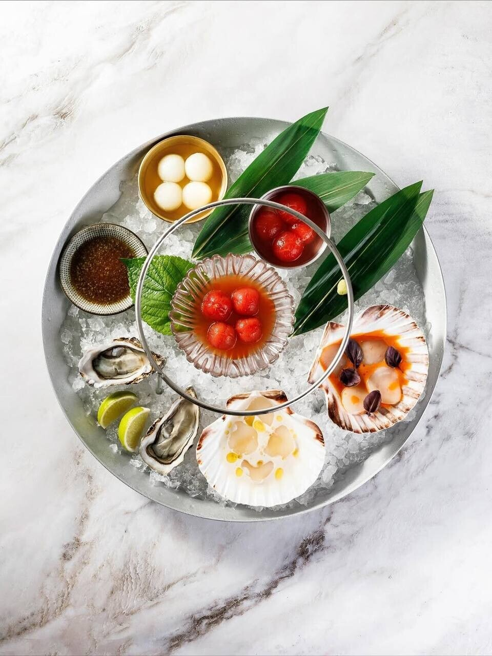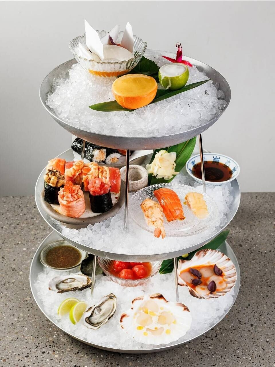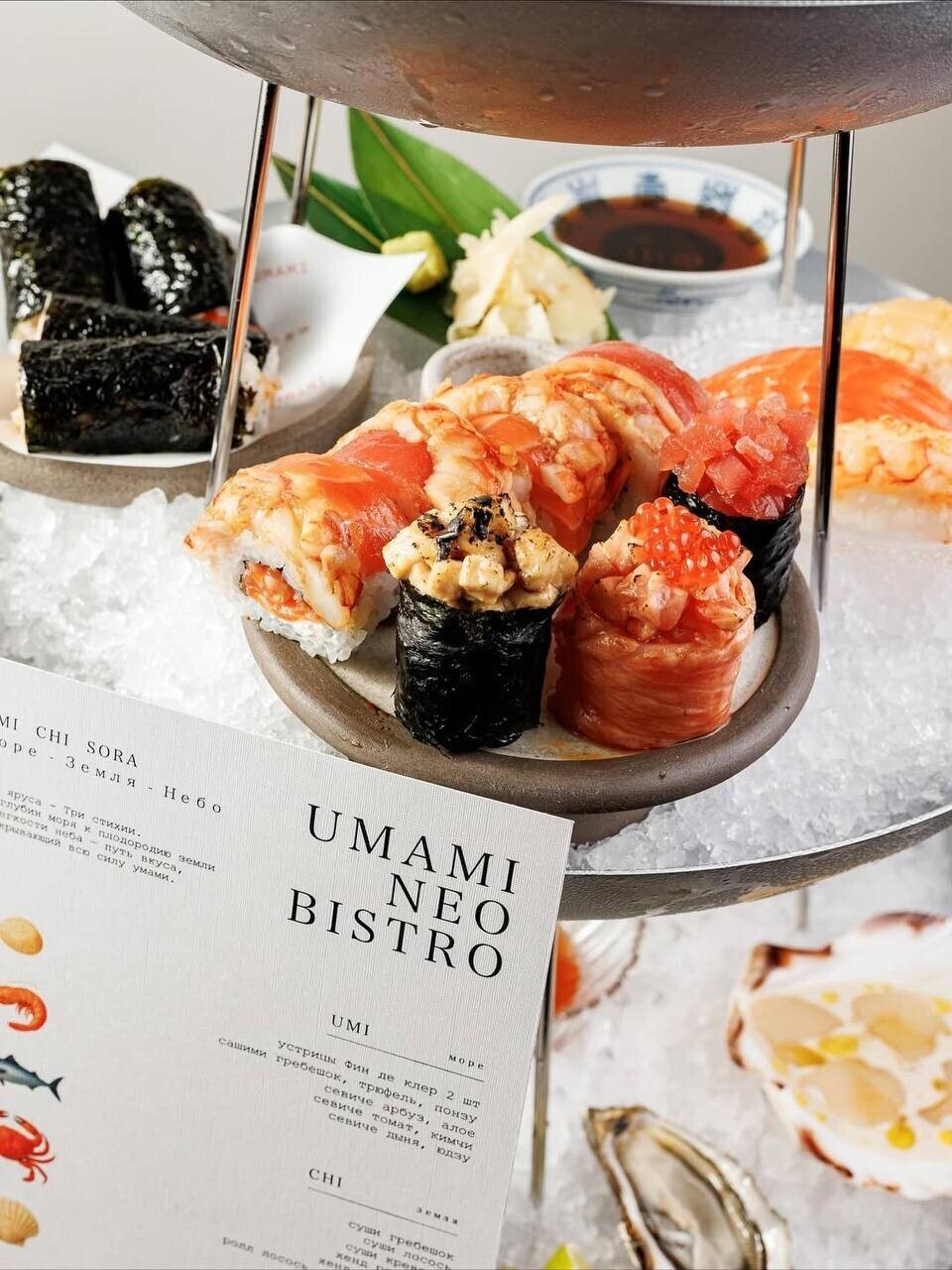Этот крутой праздничный сет будут готовить только два дня: с 17 октября с 17:00 и 18 октября с 11:00. Его концепция опирается на три стихии: море - земля - небо (именно поэтому в сете три яруса). От глубин моря к плодородию земли и легкости неба. Это путь вкуса, раскрывающий всю силу умами.