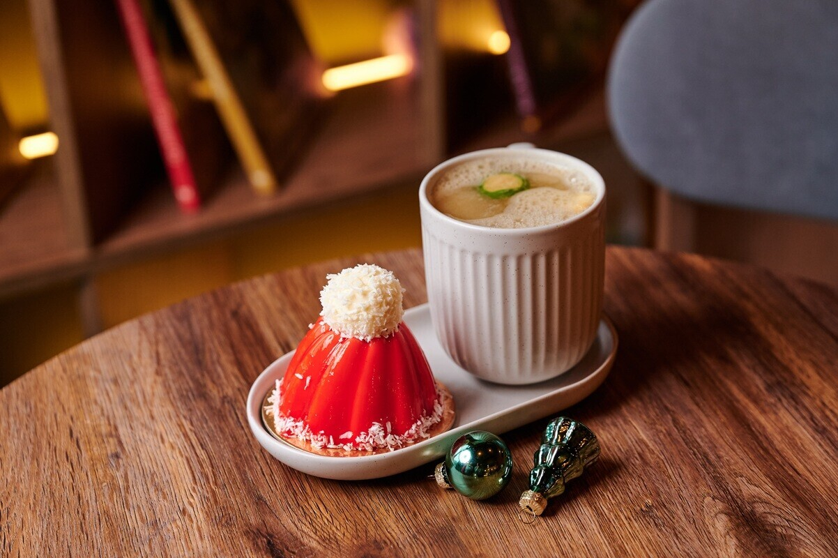 Сет, созданный по мотивам семейных рецептов. Согревающий напиток из айвы, фейхоа и имбиря, будто теплый воздух зимнего сада, и нежный десерт в виде шапочки с йогуртовым муссом, сливочным бисквитом и ягодной сердцевиной. Маленькое чудо, которое согревает изнутри.