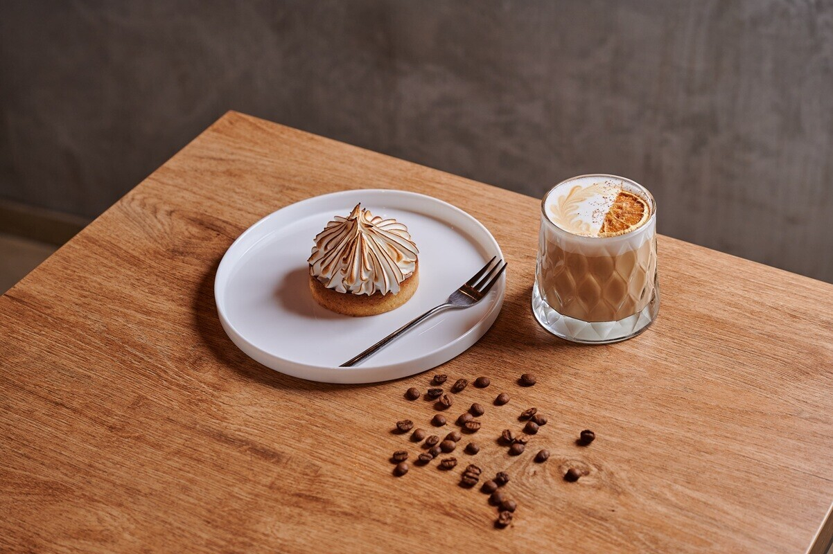 Согревающий «Апельсиновый» латте с легкой щепоткой корицы в дуэте с лимонной тарталеткой на миндальном тесте и нежной меренгой. Идеальный баланс цитрусовой свежести, сладости и кислинки, чтобы создать атмосферу зимнего уюта.