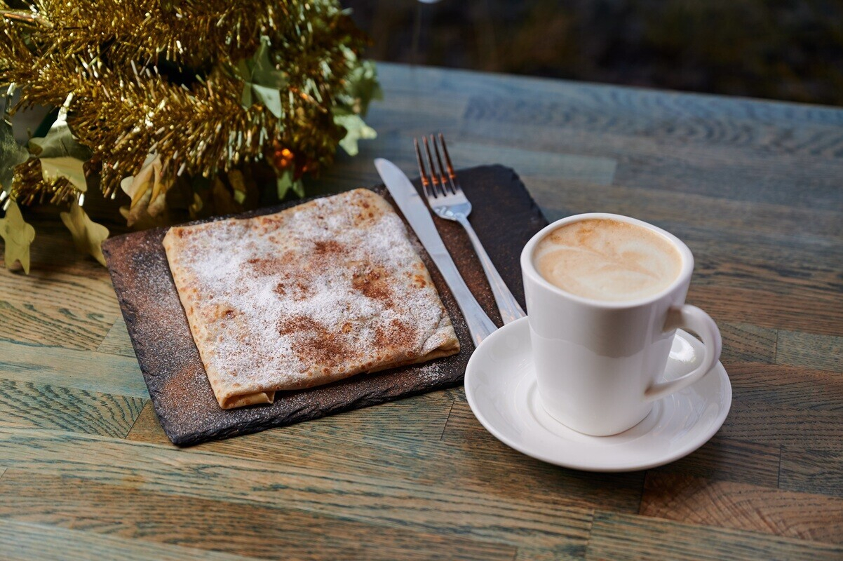 Согревающий дуэт по специальной цене: большой капучино с плотной молочной пенкой и блинчик с яблоком, сахаром и корицей. Тающий во рту блинчик, аромат зимних специй и бодрящий кофе — домашнее сочетание на максимум для счастья в Новой Боровой.