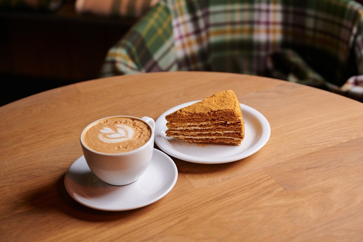 Теплый дуэт для холодного сезона: мягкий сливочный капучино и классический медовик с глубоким карамельно-медовым вкусом. Идеальный баланс, где кофе подчеркивает сладость десерта, а десерт раскрывает мягкость зерна.