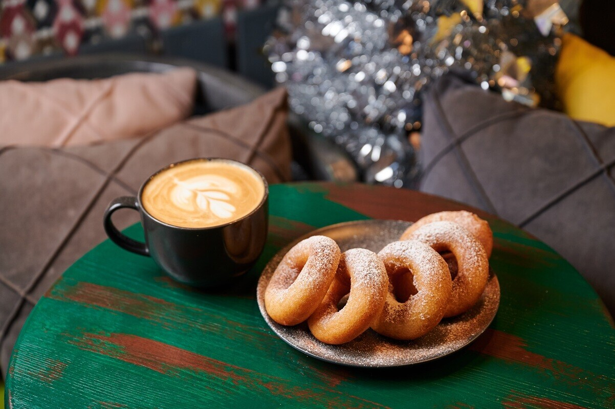 Максимальное наслаждение за специальную цену! Сет включает большой капучино (400 мл) и 5 горячих пончиков с сахаром и корицей. Идеальный вариант, чтобы взять с собой на прогулку по Новой Боровой.
