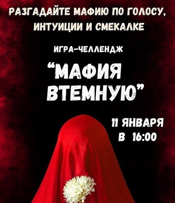«Мафия в полной темноте» — это классическая игра, где отключается зрение и обостряются интуиция, слух и логика. Участники вычисляют мафию, опираясь на голос, реакции и собственные ощущения, а сюжет делает каждую партию непредсказуемой. Нестандартный формат превращает игру в яркий психологический опыт, где всё решают вы сами.