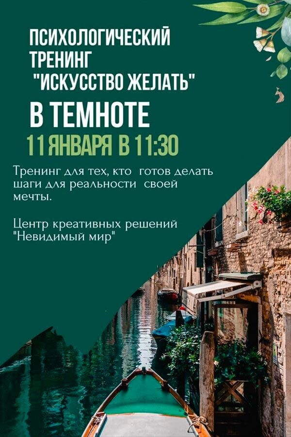 Психологический тренинг «Искусство желать» — это погружение в полную темноту, где отключается визуальный шум и включается интуиция. За 2,5 часа с помощью психологов вы отделите навязанные цели от истинных желаний и превратите их в четкий план действий. Это опыт глубинной честности с собой, который помогает по-настоящему понять, чего вы хотите и куда двигаться дальше.