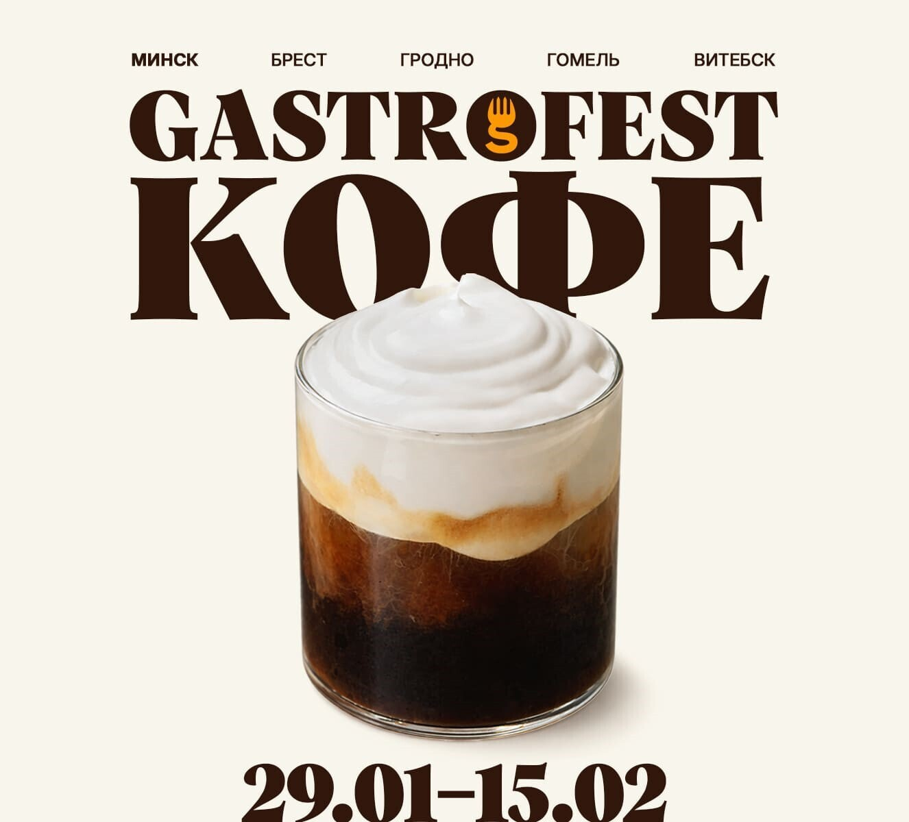 Gastrofest.Кофе объединяет кофейни пяти городов Беларуси и предлагает гостям дегустационные сеты из кофе и десерта по фиксированной цене. Фестиваль знакомит с оригинальными авторскими сочетаниями и помогает глубже понять культуру кофейных напитков. Дополнительным бонусом станет специальное предложение для гостей, оплачивающих сет картой Альфа Банка.