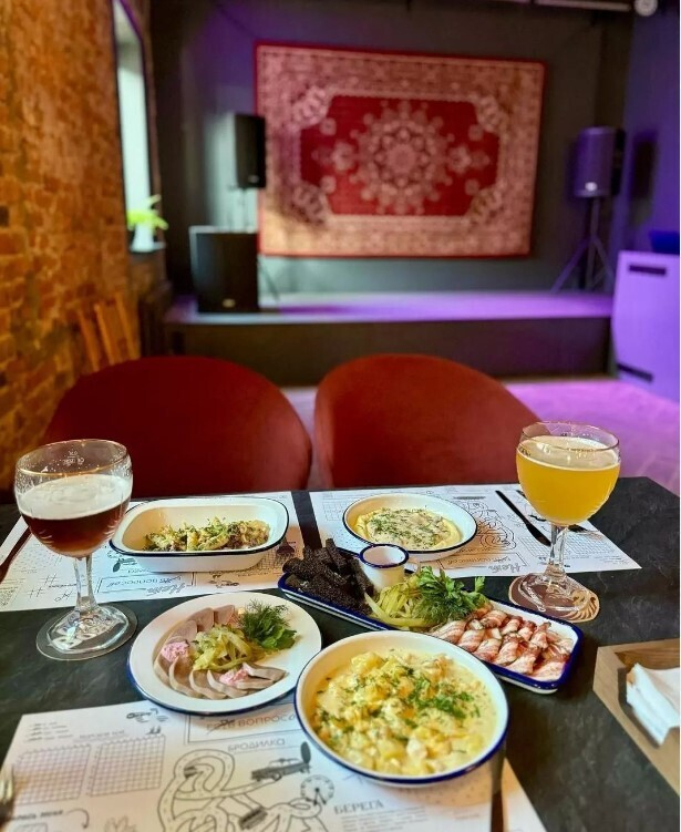 Меню демократичное, найдете все любимые позиции из детства: от котлеток с пюре до «Оливье». Коктейли подают креативно (посмотрите на фото ниже). Да, и обязательно попробуйте трубочку со сгущенкой! Подробнее здесь.