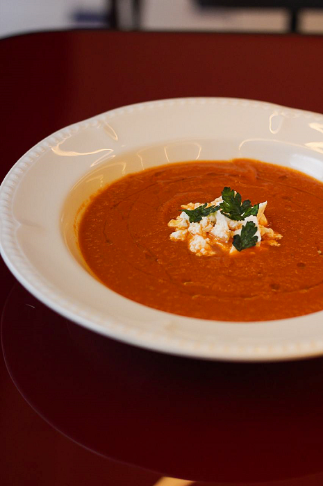 Суп приготовлен из свежих томатов с добавлением корня сельдерея, лука и моркови. Особый аромат привносят специи: орегано и фенхель. Гастрономическое единство завершает брынза: приходит осознание уже при дегустации: «так вот чего не хватало!».
