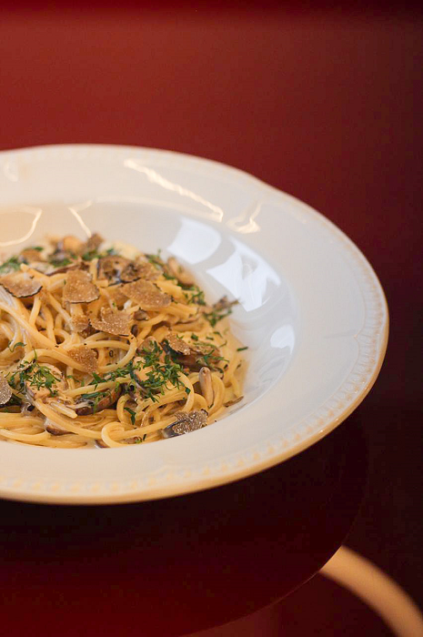 Секрет вкусной пасты, конечно же, в соусе. Обжаренный чеснок, лук-шалот, тимьян, шампиньоны. Это сочетание ингредиентов даже на слух обладает характерной ароматикой и вкусом. Также в составе есть сливки и петрушка, в завершение — трюфель.