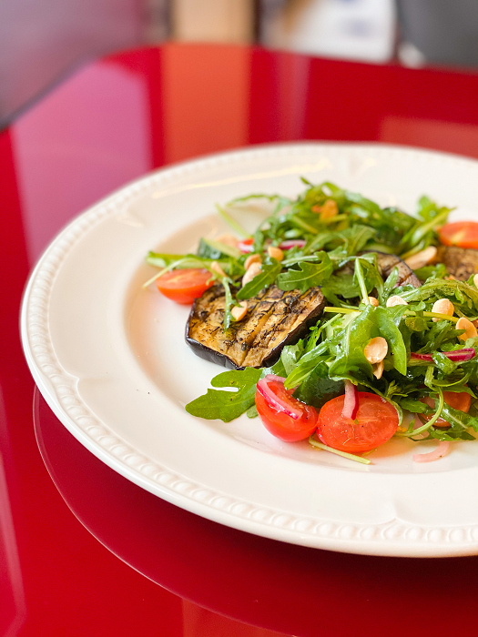 Изюминка вкуса в овощном сочетании вместе с баклажаном, запеченным с ароматными травами. Повар добавляет тимьян, который и придает шарм привычному баклажану. Завершает композицию жареный арахис. Блюдо подойдет вегетарианцам и гостям, которые следят за калорийностью блюд.