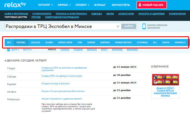 Но если вы консерватор и никакая скидка не выманит вас за покупками и развлечениями из любимого торгового центра. Не беда. Специально для вас — рубрика «Торговые центры». Вам лишь надо выбрать свой любимый ТЦ из предложенного списка и вуаля — отобразятся все магазины и заведения, у которых есть на данный момент акции. |