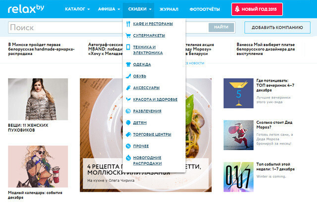 Relax.by рад представить своим пользователям новый проект о самых «вкусных» скидках в городах Беларуси — skidki.relax.by. Благодаря новому сервису теперь легко найти акции и «счастливые часы» в супермаркетах, торговых центрах, ресторанах, медицинских центрах и даже очень выгодно купить билет на концерт.