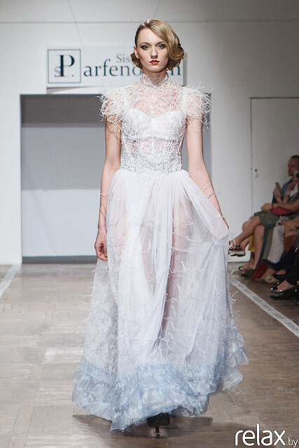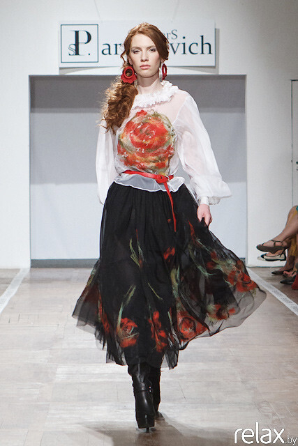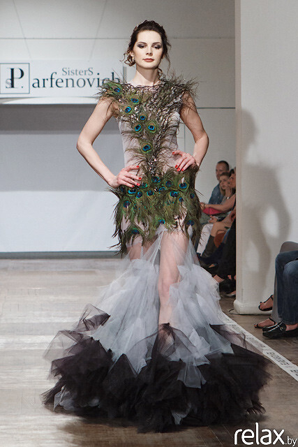 Показ сестер Парфенович был поделен на две части. Одна более носибельная и зимняя. Вторая – вечерняя. Первая часть называется «Цветы года». Яркие маки оживают на широких юбках моделей, и так хочется примерить в холодную пору. Основной силуэт – это фигура Снегурочки: широкие плечи, узкая талия, широкая юбка и все это завершается складчатыми сапогами. Очень по-русски, на любителя, но стоит отметить интересный дизайн некоторых пальто, единую тематику и атмосферу, а также живые и яркие маки на платьях, которые кажется так и колышутся на ветру. Вторая часть была вечерней. И тут Парфенович показали весь свой талант. Коллекция называлась «Черный лебедь» и была посвящена, а вернее вдохновлена, птицами. В коллекции было много платьев с перьями, с длинными подолами, которые, похоже, символизировали пышные хвосты райских птиц. Детальная работа нарядов поразительна. Подобные платья если и не купить хочет каждая, то примерить точно. И если бы белорусскую актрису номинировали на Оскар, главными дизайнерами для этой номинантки стали бы именно сестры Парфенович.