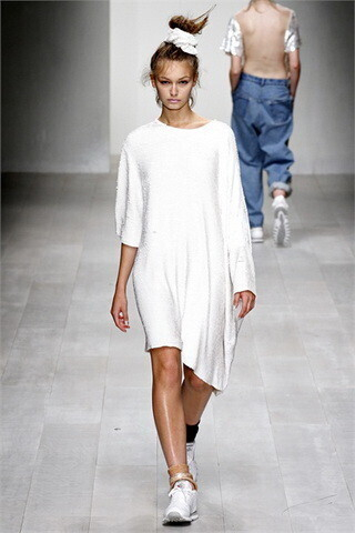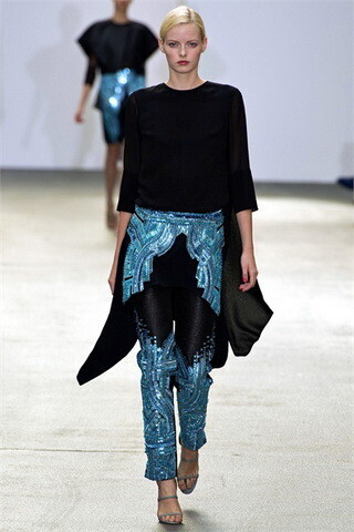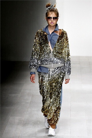 Один из самых творческих брендов, Ashish, на этот раз решился отказаться от цвета, но не от пайеток. Их и в этой коллекции хоть отбавляй. Определить тему и источник вдохновения дизайнеров очень легко, все «следы» указывают на явные и немного безвкусные поздние 80-ые: блестки, небрежные пучки, джинс с ног до головы, длина мини и перламутровая помада. С помощью этой коллекции можно с легкостью воссоздать образ с фотографий группы «Мираж» или «Комбинация». Впрочем, за это Ashish и любят: юмор, креативность и состояние на грани между вкусом и безвкусицей.