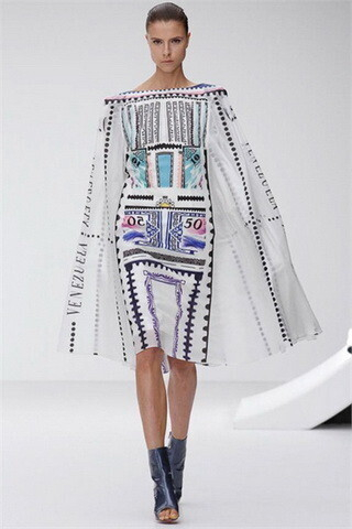 В первую очередь, это, конечно же, принты. Умело выполненные, похожие на коллекционный альбом с марками различных стран и денежных купюр. Водные знаки складываются в удивительные волны на платьях, а не остаются привычным отличительным знаком купюры. Коллекция выполнена творчески и мастерски. Если слово «творчески» относится к умело «склеенным» коллажам, то «мастерски» - к выполненному крою.