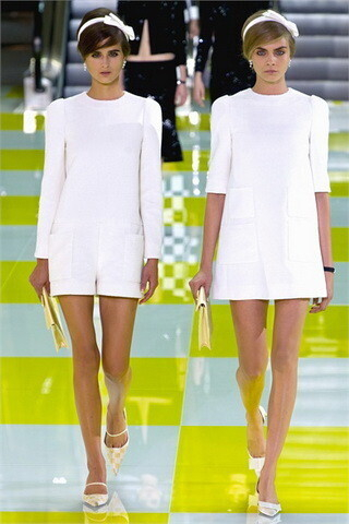 Коллекция весна-лето 2013 – это попадание в тренд возрождения стиля 60-ых и популярности геометрических принтов в новом сезоне. У Марка это квадраты, а не линии, как у многих или в его личной коллекции. Из коллекции Marc Jacobs в Louis Vuitton перекачивали короткие топы и длинные узкие юбки, прически-улей с челкой набок, обувь и мейк-ап. «Да почти все» – скажут многие! Только парижская версия – более дорогая, шикарная и женственная, как и должно быть.