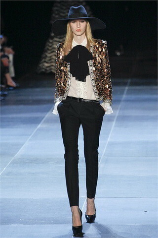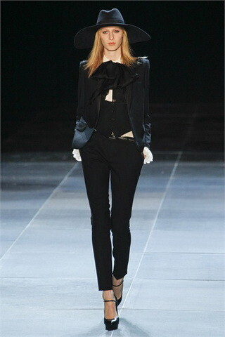 Многие упрекнули Эди в том, что на подиуме было больше осени, чем весны, а ведьмовские наряды из 70-ых – уж не совсем подходят под классическое понятие бренда. Однако, углубившись, можно увидеть, что Слиман не более чем просто переродил бренд, воссоздав в коллекции вещи по старым эскизам. В Saint Laurent снова есть шикарные, а-ля мужские, костюмы, которые делают ноги бесконечными, классические накидки, некий шарм и загадочность, что тоже свойственно потенциальным клиенткам бренда. От себя Эди добавил широкополые шляпы, похожие мы не раз видали в мужских коллекциях Dior, и нотку рок-н-ролла, которую не отнять у одного из самых загадочных фотографов-дизайнеров современности.