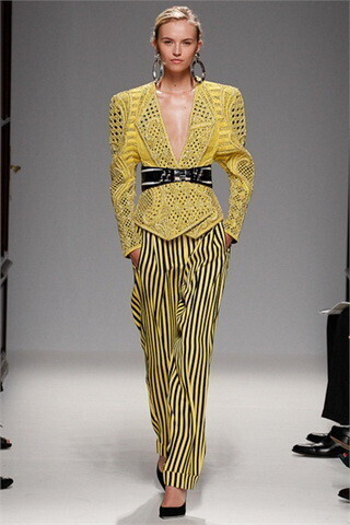 В новой коллекции основным цветом является желтый и присутствует четкий дух 80-ых годов, который отлично отражает настроение коллекции – игривое, сексуальное, немного бунтарское. Укороченные широкие жакеты Balmain предлагает носить с широкими брюками с завышенной талией и не стесняться принтов: в новом сезоне это мозаика и сверхмодная полоска.