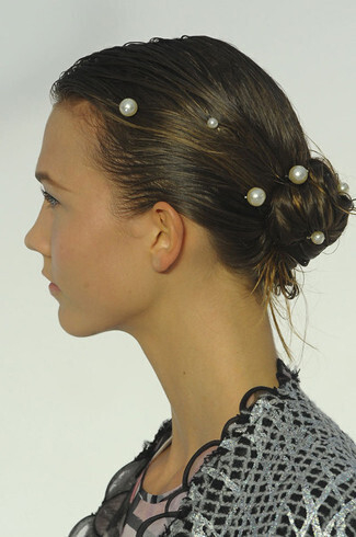 Главным трендом этого сезона также являются убранные волосы с мокрым эффектом. Первый вариант — это распущенные волосы и зачесанная челка гелем с мокрым эффектом назад. Этот образ можно прировнять к девушкам Бонда, которые эффектно выходят из морских волн, убирая волосы назад. Но такой вариант подойдет скорее для выхода в свет. Для повседневной рутины подойдут гладко зачесанные волосы в хвост или пучок, необычно украшеные интересной заколкой.
