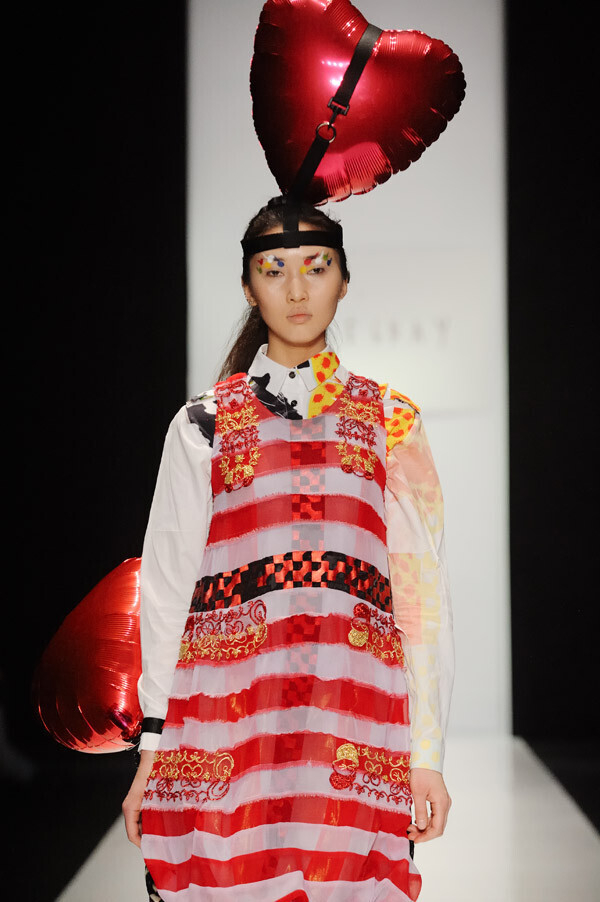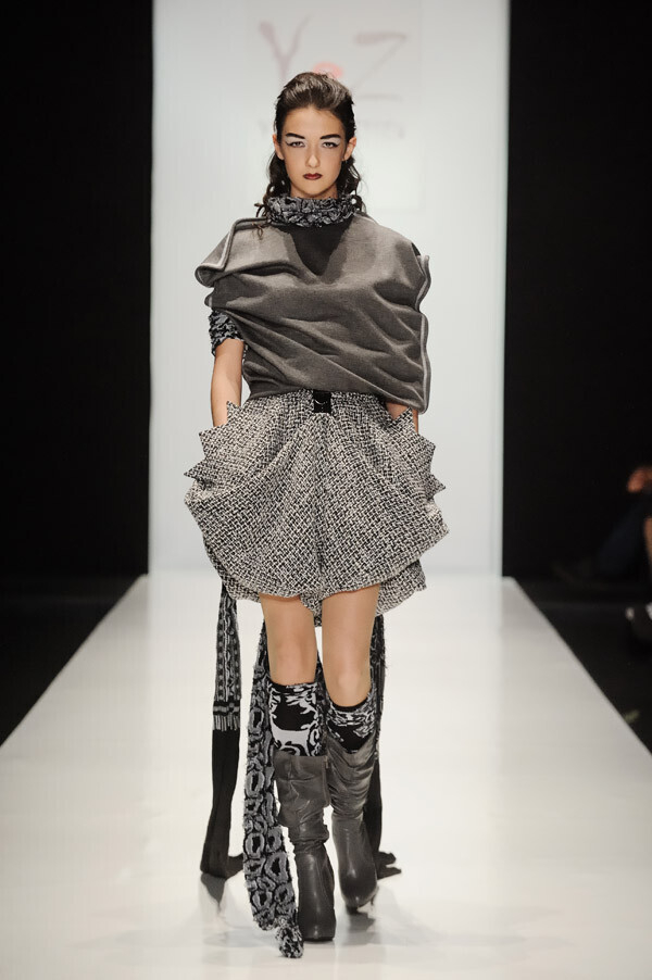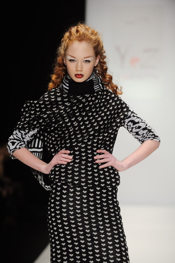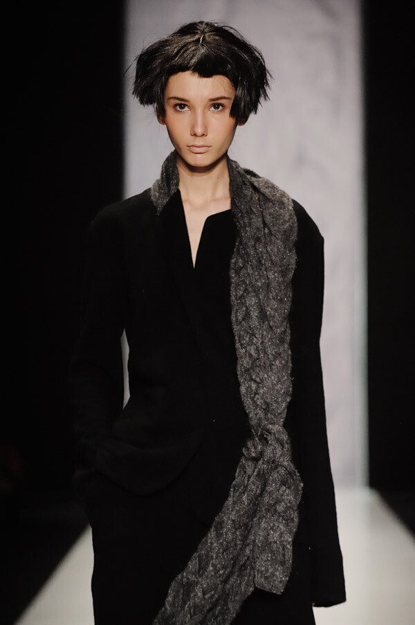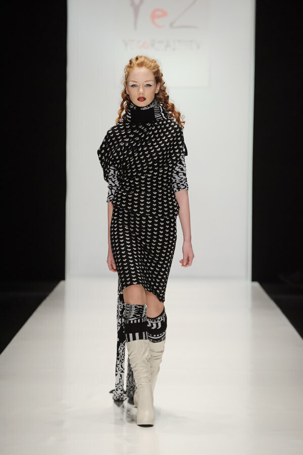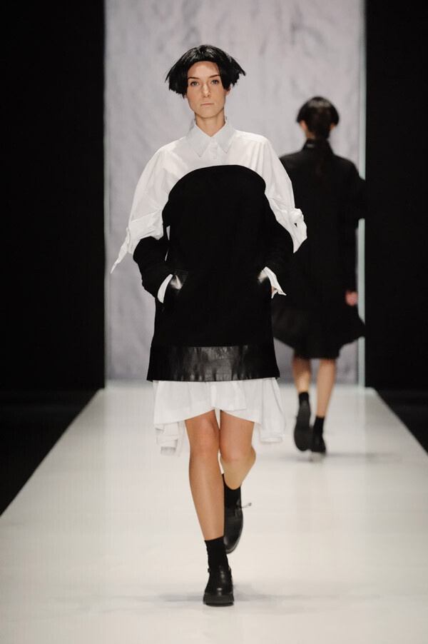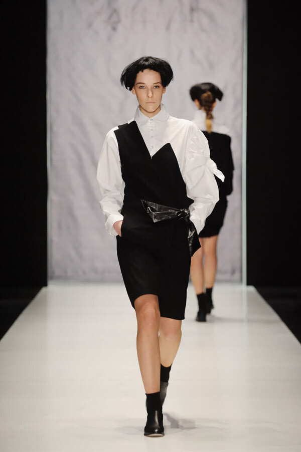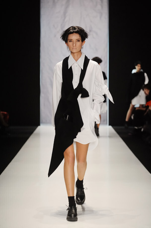 Егор Зайцев. Обладающий неповторимой индивидуальностью, российский дизайнер сделал свою коллекцию в этот раз чуть более сдержанной. Буйство красок, привычное для Зайцева, сменилось черно-серо-белой гаммой. Единственным ярким дополнением красно-бело-черные повязки на руках, совпадающие с цветами модного бренда.