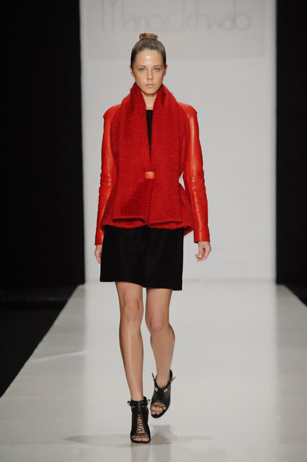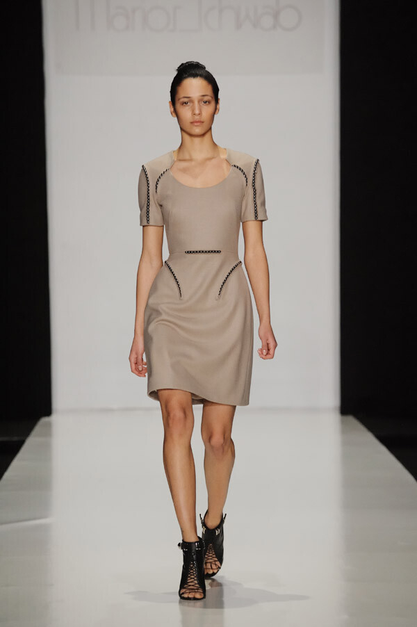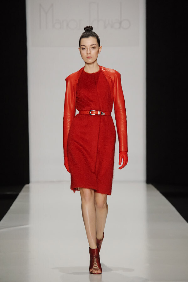Marios Schwab. Главный элемент коллекции – кожа, которая, оказывается, умеет так хорошо сочетаться с совершенно разными материалами.