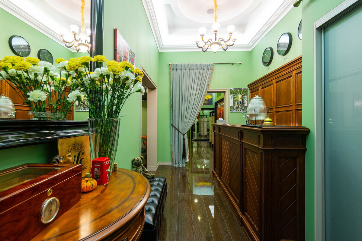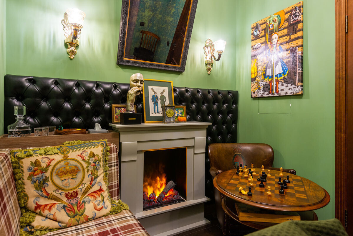 В интерьере преобладает благородный зеленый цвет, дерево, спокойное и мягкое освещение. Обращают на себя внимание и атмосферные акценты: камин, клетчатый плед, старинные часы и картины.