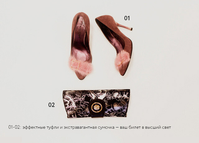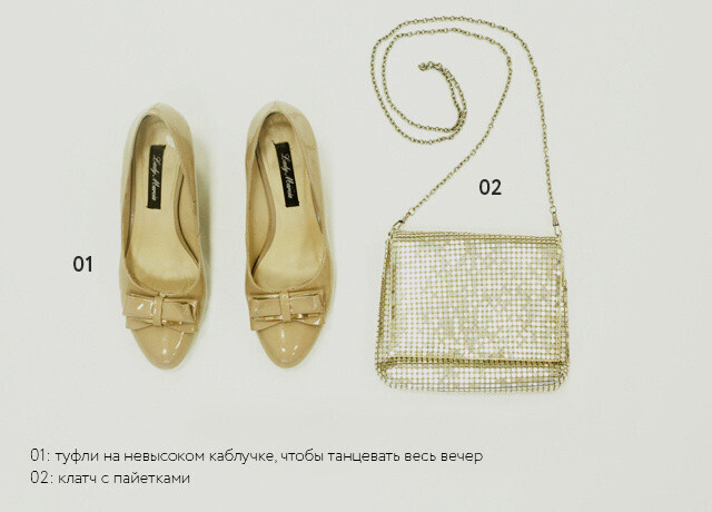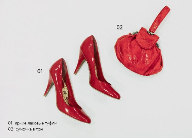 Нужный нам образ создают эффектные туфли (папарацци истратят на них не один десяток кадров) и броские украшения. В нашем случае это колье, которое неплохо было бы дополнить коктейльным кольцом в тон. Сумочку можно взять попроще.