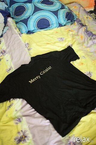 Майка от Цеслера. Подарок еще одного выдающегося человека нашей страны Владимира Цеслера. Вот кто всегда попадает в точку! Майка Merry Crisis, по-моему, как никогда актуальна. Мне она не по размеру, но признаюсь по секрету, она пользуется популярностью в качестве гостевой ночнушки для девушек, задержавшихся у меня в гостях и опоздавших на последний трамвай.