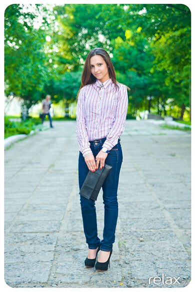 Милая, «скромная» Елена с тонким вкусом отлично владеет правилом стиля: происхождение вещей не имеет значения — главное, как они смотрятся вместе и конкретно на вас. Но, как говорится, нет предела совершенству. В данном случае хотелось бы либо уравновесить матовую фактуру обуви и ее цвет чем-то в верхней части комплекта такого же оттенка. На таком рисунке рубашки эта изящная брошь слегка затерялась. Либо же можно «облегчить» обувь, сменив на более «воздушные» босоножки либо изящные туфли на шпильке, но светлого оттенка. Шлевки в джинсах (либо брюках) предполагают ремень. При выборе этого аксессуара девушка может полагаться на свою интуицию, которая наверняка ее не подведет. Идеальные очки как завершающий штрих образа — великолепно!