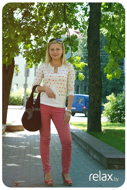 Яркие блондинки могут позволить себе носить более спокойную цветовую гамму и более простые формы в одежде и аксессуарах. В случае с Татьяной выбран верный оттенок красного — приглушенный коралловый и созвучная по цвету брюкам обувь. Хотелось бы слегка «облегчить» верхнюю часть комплекта: сумку более лаконичной форм и без декора, одного браслета было бы также достаточно. Принт кардигана выглядит не очень серьезным. Однако, если задача — выглядеть гораздо моложе своих лет, то она успешно выполнена.