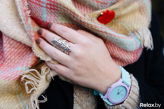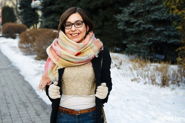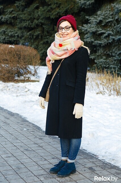 Яркий теплый шарф, как ни удивительно, я купила в маленьком магазинчике жаркого Израиля (хотя в Беларуси такого найти не могла). Брошь «Гранат», что на нем, — подарок на прошедший Новый год. Находка года — пальто H&M, которое я тоже забрала из минского «секонда» за 17 деноминированных рублей. Чем аргументирована такая цена — мне не известно: в нем нет изъянов.