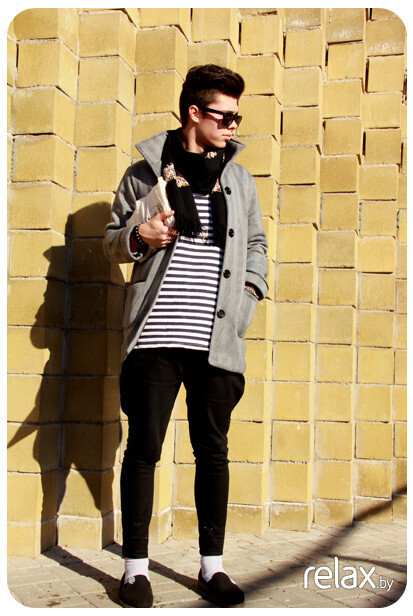 Одежда: Тельняшка и «тапки» куплены в ГУМе, пальто — second hand.
