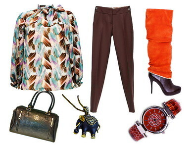 Теплые оттенки в одежде действительно способны согреть, а еще и добавить уверенности и радости в повседневное настроение. Позвольте себе быть смелее, и вы почувствуете какой удивительной может быть любая пора года. Сделайте акцент на яркой обуви: оранжевый цвет отлично сочетается с коричневым. Продлите настроение в оттенках тех же цветов в блузке с интересным принтом и завершите образ нестандартными аксессуарами. Подвеска в виде слона и часы с ремешком из кожи рептилии добавят экзотичности и напомнят о теплых краях.