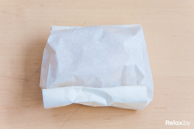 Бургер обильно смазан соусом из кетчупа и горчицы, он вытекает, но есть это не мешает. Листья салата ярко-зеленого цвета, но сорт мы так и не определили. К слову, есть любой бургер правильно, не доставая его из пергамента, как это делают в McDonald's: это позволяет держать продукту форму.