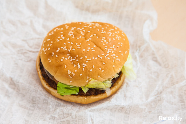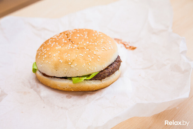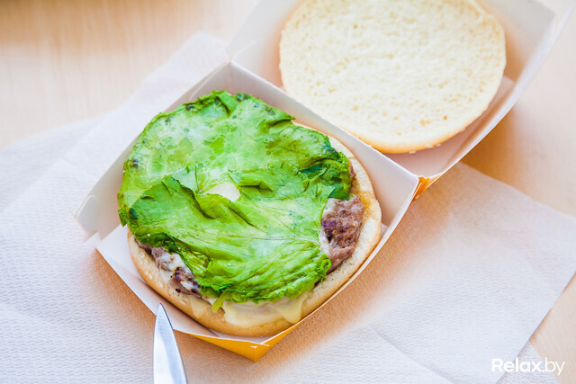 Внешне бургер выглядит приемлемо, но, когда начинаем разбирать, замечаем, что верхняя часть булки совсем не пропитана соусом: сухая, по вкусу напоминающая обычный батон. С листами салата тоже есть проблема: ни один салат не выдерживает температур, при которых готовят бургеры, в контакте с котлетой через достаточно короткое время он превращается в «тряпку».