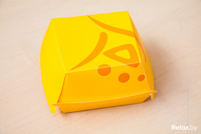 Вид упаковки: Есть коробка, бургер упакован в пергаментную бумагу. Идентификация — наклейкой.