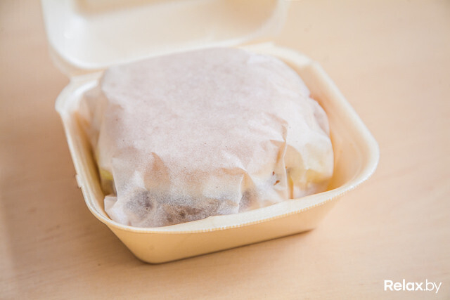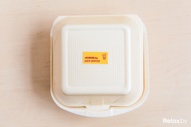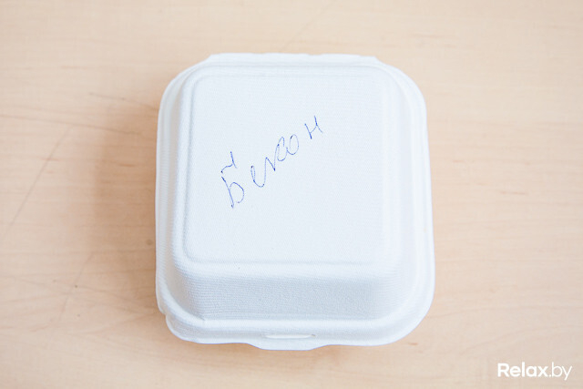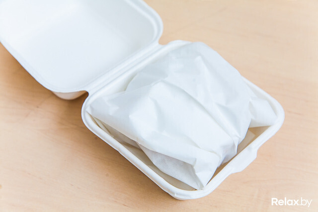 Вид упаковки: Коробка выполнена из экоматериала, бургер завернут в пергаментный лист. Идентификация — шариковой ручкой.
