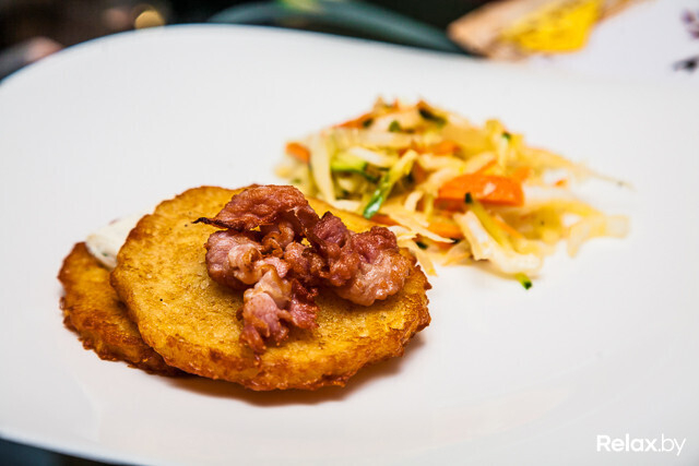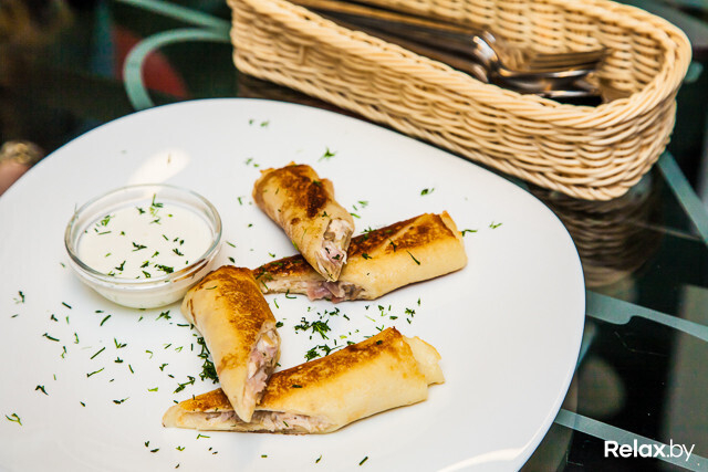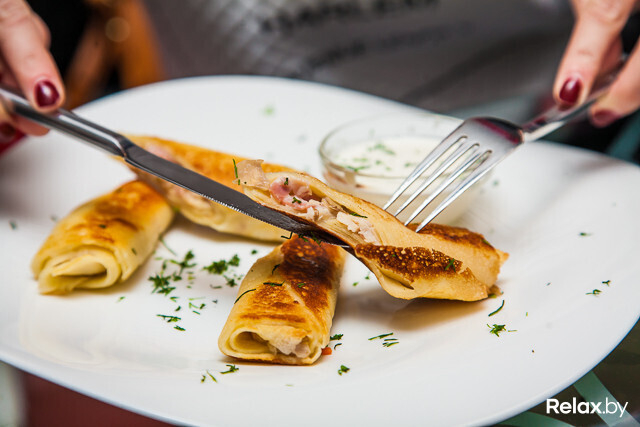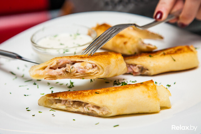 Еда. Кухня здесь работает действительно быстро. Первое блюдо принесли на девятой минуте. Блинчики с ветчиной, курицей и грибами годные: сытно, по-домашнему. Разве что стоит на стадии заказа уточнить у официанта, нужен ли вам в составе лук (на любителя). Среди небанальных позиций выбираем жульен в булочке: горячий, в меру насыщенный. Крышка булочки немного суховата, но это не критично.